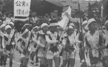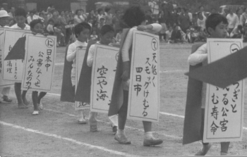 ひどくなる公害への抗議をこめた仮装行列が地区の運動会に登場した。
